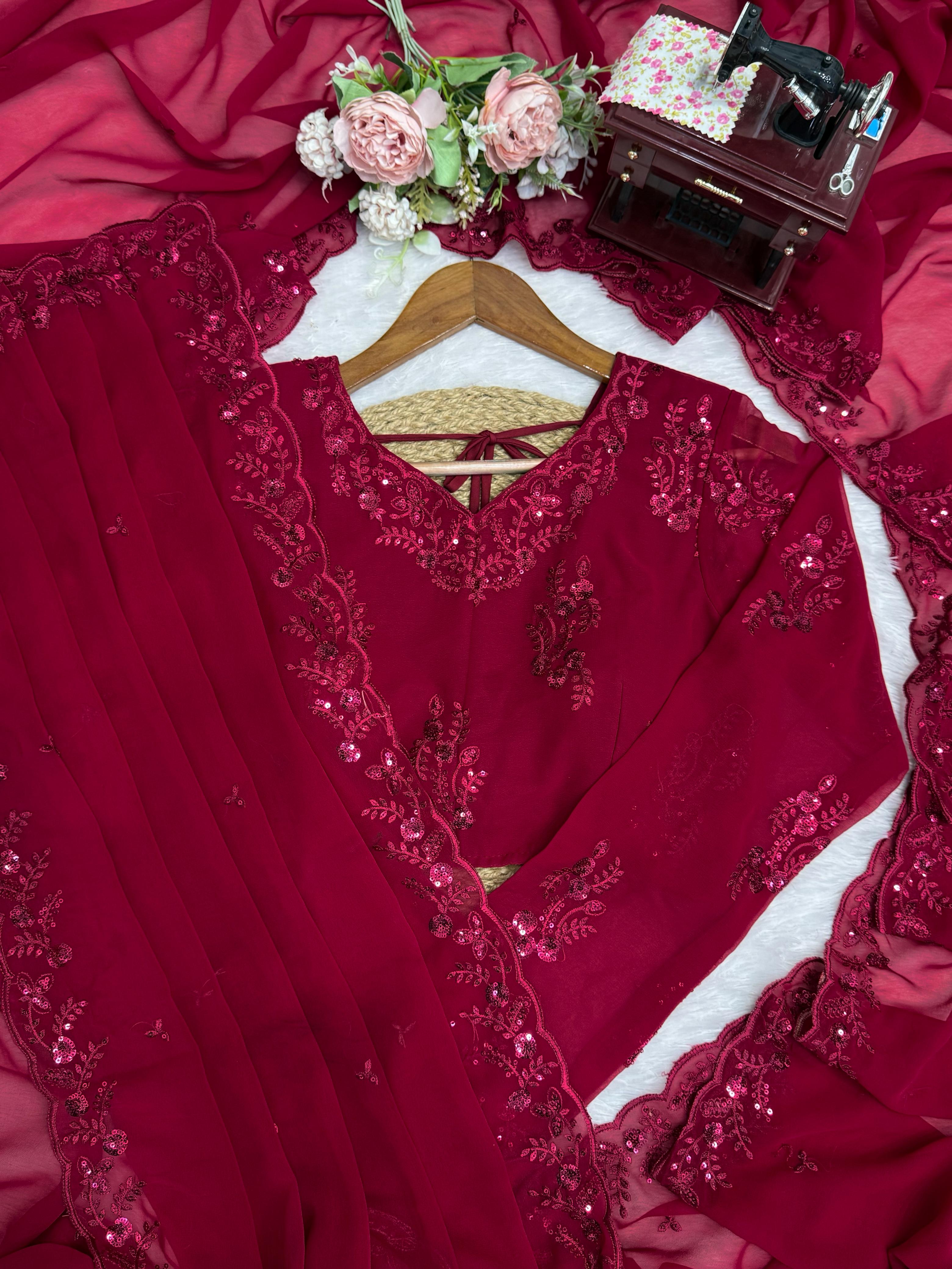 Step into any event with regal confidence in this stunning designer saree. Crafted in a captivating, rich maroon hue, this ensemble is the perfect blend of traditional grace and contemporary glam, making it an absolute statement piece for your wedding and festive wardrobe.